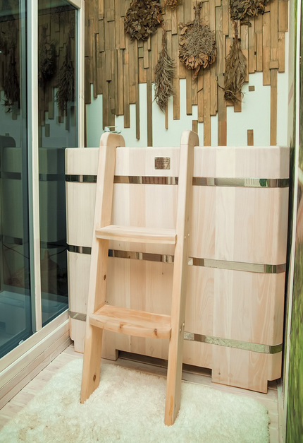Купель идеально вписалась в помещение. Мини-бассейн из кедра - полезно, весело и практично! Рекомендую!