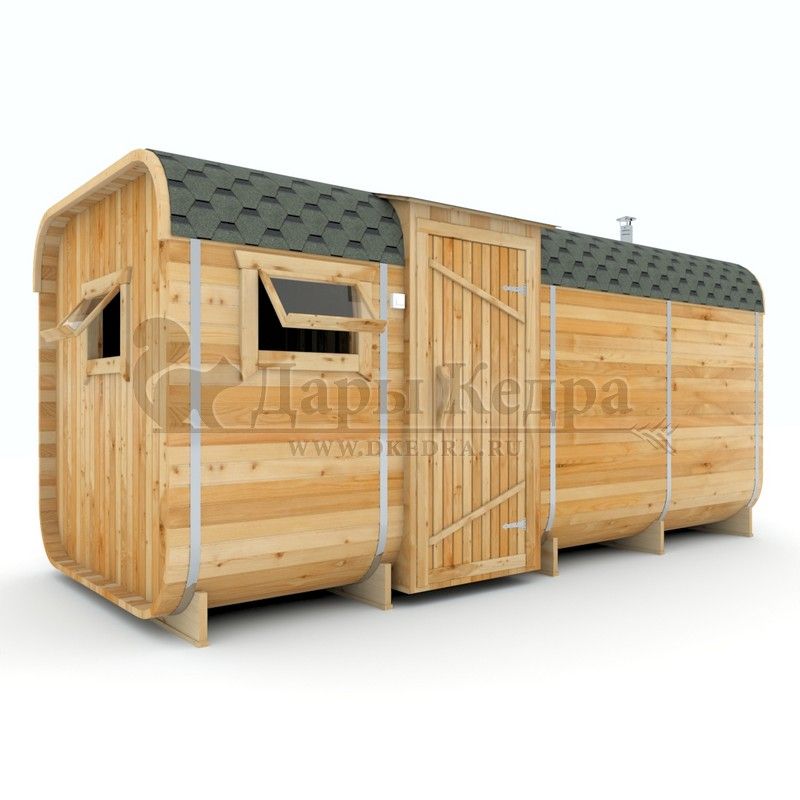 Баня-бочка буханка из кедра с верандой (все размеры) Баня-буханка более просторная за счет увеличенной высоты потолков и ровного пола. На веранде можно оставить вещи или отдохнуть после процедур парения. Лавочки из кедра находятся по всей длине бани-бочки с обеих сторон. Печь расположена в парилке около дальней стены. Время растопки такой бани не превышает 30 минут. В зависимости от выбранного размера баня-бочка буханка с верандой имеет следующую комплектацию: Баня-бочка буханка 2,5 метра - парилка; Баня-бочка буханка 3,5 и 4,5 метра - раздевалка, парилка; Баня-бочка буханка 5,5 метров - раздевалка, парилка, моечная. По вашему желанию ее можно укомплектовать печью с внешней загрузкой, благодаря которой весь мусор вовремя топки остается на улице. Баня-бочка буханка не требует полноценный фундамент, поэтому при необходимости ее можно перенести в другое место. Обращаем Ваше внимание, что в стандартную комплектацию бани входят полки открытого типа в парной с обеих сторон. Дополнительно можно заказать полок закрытого типа или лавку! Кедр обладает ароматическими свойствами. Он не деформируется и влагоустойчив, при правильном уходе за деревом на нем не развиваются грибки и плесень.