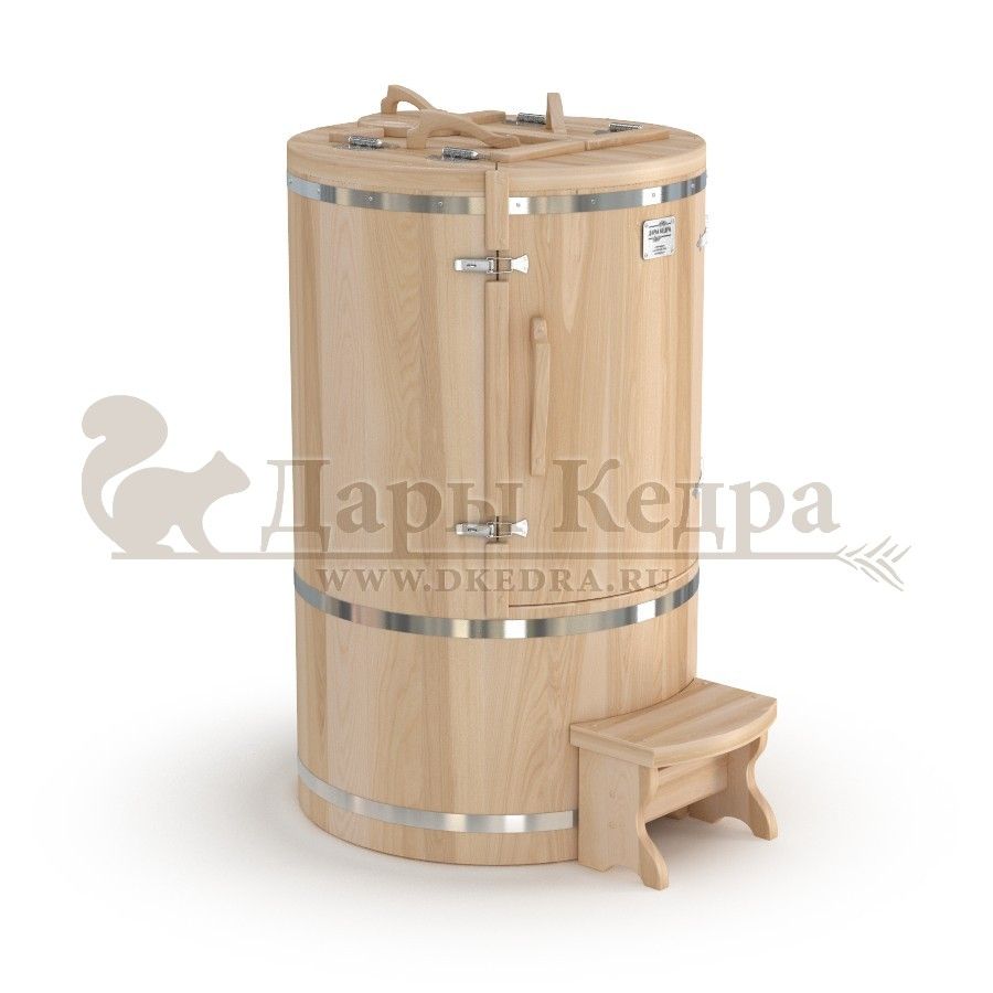 Круглая фитобочка из кедра - это мини парная, которую можно использовать не только в спа-салонах, но и дома. Такая модель наиболее компактна и мобильна. Толщина стенок составляет 40-45 мм, что позволяет увеличить срок службы изделия. Фитобочка оборудована откидными створками, дверцей и отверстием для головы. Во время парения человек сидит внутри кедровой бочки, а голова находится снаружи. Благодаря этому исключается возможность перегрева. Подлокотники из кедра, встроенные ручки на створках и двери делают эксплуатацию более удобной.