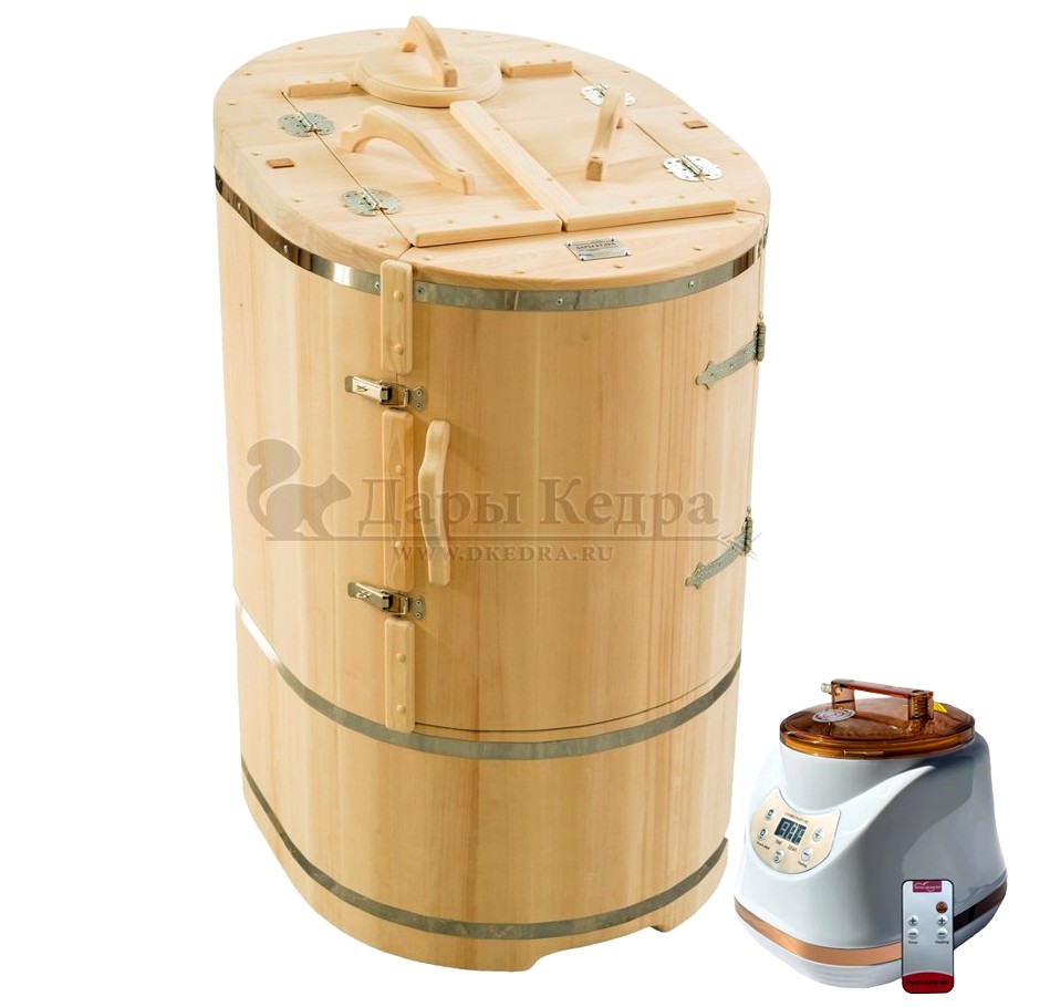 Готовый комплект - это полностью укомплектованный набор с фитобочкой для процедур парения. Овальная модель более просторна и удобна в использовании. Толщина стенок составляет 25 мм. Бочка оборудована откидными створками, дверцей и отверстием для головы. Верхний скос изделия делает положение головы более комфортным и улучшает обзор. Во время парения человек сидит внутри кедровой бочки, а голова находится снаружи. Благодаря этому исключается возможность перегрева. Подлокотники из кедра, встроенные ручки на створках и двери делают эксплуатацию более удобной.