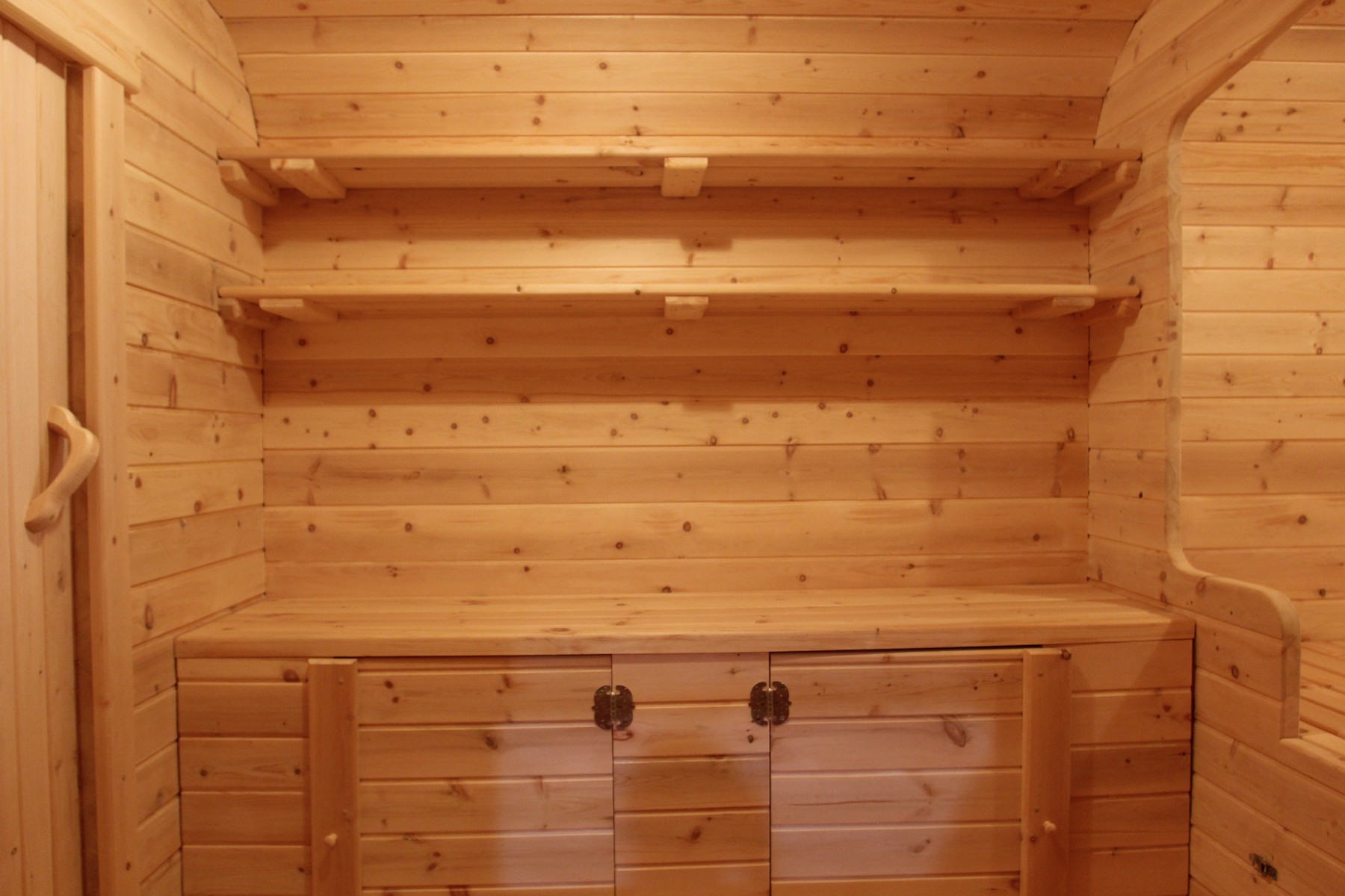 Домик с тремя помещениями подходит для дачного использования в теплое время года или обустройства загородных баз отдыха. Прихожая и кухня занимают одну комнату, в которой стоит стол из кедра. Две другие оборудованы четырьмя деревянными лежаками, по желанию их можно заменить на двуспальные кровати. Либо обустроить санузлом и душевой зоной. Для удобства пользования кемпинг дом можно укомплектовать верандой с лавочками или козырьком.