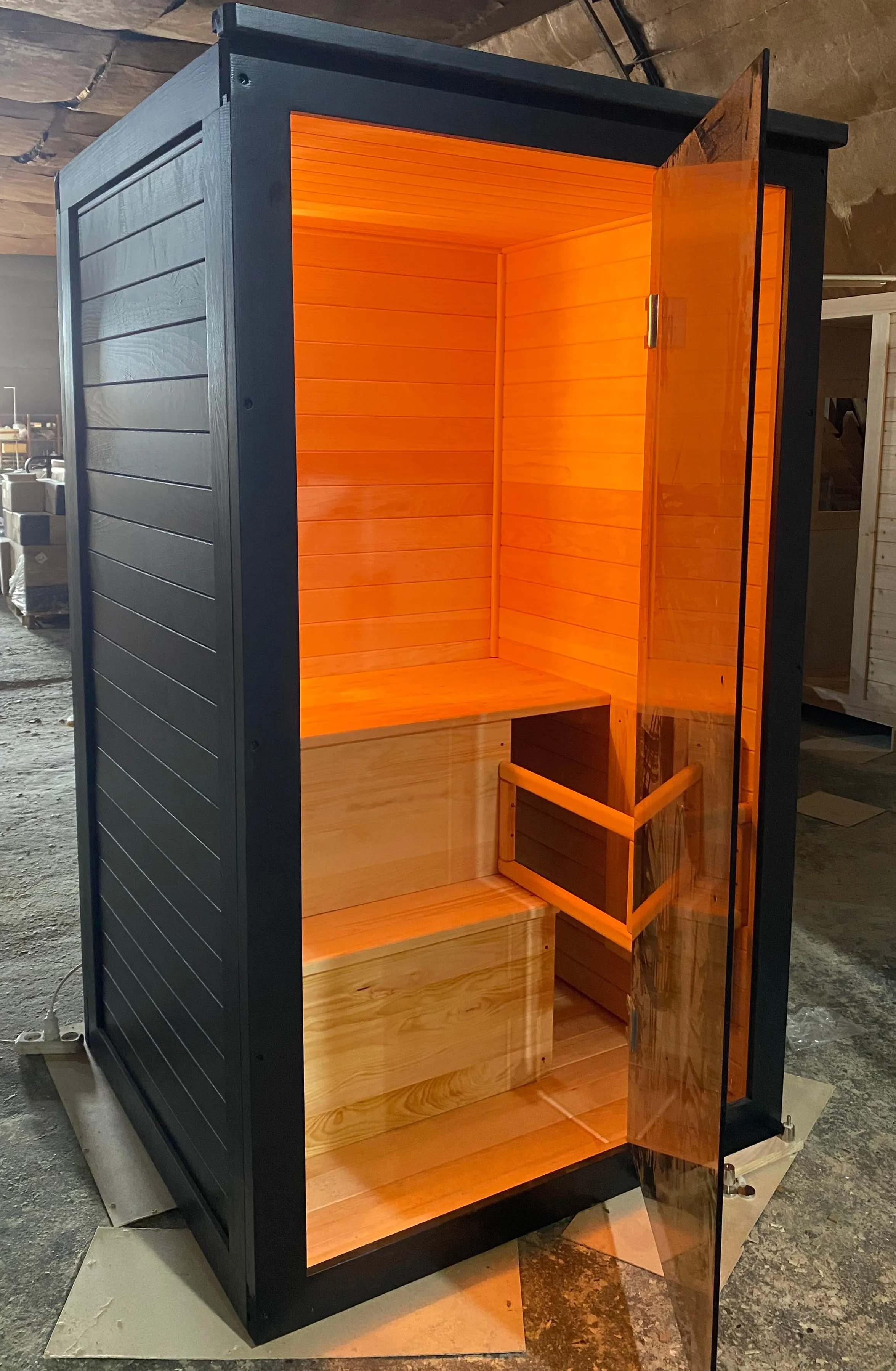 Это специально оборудованная кедровая кабина для прогрева тела человека сухим теплом. Воздух в таких парных не нагревается. Инфракрасные лучи воздействуют на тело, равномерно прогревая мышцы, суставы и органы. Карбоновые излучатели, встроенные в стены кабины, обладают мягким прогревом, что полностью исключает возможность ожога. Работает кабина за счет электричества. Установка сауны в угол, позволяет рационально использовать пространство помещения. Подходит как для домашнего использования, так и для коммерции.